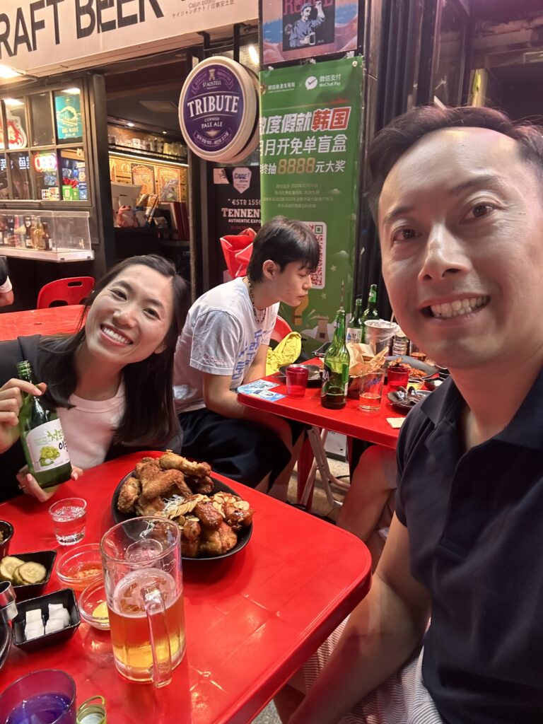 At our hairdresser’s urging, we found ourselves at Oppadak in Myeongdong — and it proved a recommendation worth repeating thanks for. The place buzzed with locals, a sign we were in for something good. Soon baskets of chicken arrived, golden, glistening, and impossibly crisp. Oppadak’s twist — frying the chicken in olive oil — kept it lighter, the crunch delicate but addictive. We kept reaching for more, grateful that sometimes the best finds come not from guidebooks but from casual wisdom in a barber’s chair.